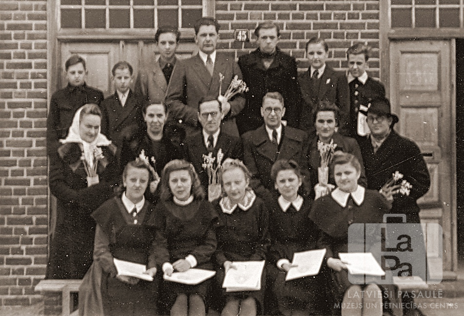 Fotogrāfijas dāvinātāja rakstītais atmiņu stāsts par bēgļu gaitām un bēgļu nometnēm: "Mans trimdas sākumceļš. Tūkstoš deviņi simti četrdesmit ceturtā gada vasaru pavadīju kopā ar savu brāli Jāni Stendes pagasta Jāņa Adamoviča vārdā nosauktajā 4. klasīgajā pamatskolā. Šinī skolā mana tēva māsa strādāja kā skolas pārzine. Vasaras sākums, kā atceros, pagāja mierīgi. Pēc Jāņiem viss mainījās. Uz ceļiem parādījās bēgļu vezumi. Bija daudz krievu bēgļu, kā arī latvieši no Vidzemes un Latgales. Visi bēga no krieviem, kuri neatlaidīgi tuvojās Rīgai. Par vasaru vecāki dzīvoja Rīgā. Vasaras otrā pusē vecāki bija plānojuši ierasties Stendē, bet tam gandrīz tika "pārvilkta strīpa”. Krievi kaut kad septembra sākumā izlauzās no Jelgavas cauri uz Tukumu un Rīgas jūras līci. Ceļš no Rīgas bija nogriezts. Bet šis parrāvums ilga tikai pāris dienas, jo tika likvidēts dažas dienas vēlāk. Ceļš bija brīvs, un vecāki ieradās Stendē. Izbraucām no Stendes agrā, aukstā, miglainā oktobra rītā. (Ja nemaldos, bija oktobra otrā puse). Braucām uz Liepāju. Liepājā mēs iebraucām tās pašas dienas vēlā vakarā. Pāris dienas pavadījām Tautas Palīdzības namā. Pēc pāris dienām devāmies tālāk. Vēlā pēcpusdienā mūs veda uz ostu, lai kāptu uz kuģa un dotos trimdā uz Vāciju. Kuģi sauca, ja atceros pareizi, "Volta”. No Liepājas izbaucām dziļā tumsā. Visi stāvēja uz klāja un dziedāja "Dievs, Svētī Latviju”. Otrās dienas vēlā pēcpusdienā iebraucām Dancigā un tālāk ar vilcienu uz Gotenhafenu, lai atutotos. Tur pavadījām pāris dienas un tad tālāk ar vilcienu uz Arnsvaldi. Mūs novietoja vienā skolā. Šeit atradās arī bēgļi no Igaunijas, Lietuvas un Čehoslovākijas. Šinī mazajā, jaukajā pilsētiņā pavadījām pāris mēnešus. Sagaidījām šeit 18. novembri, Ziemassvētkus, kā arī Jauno gadu. Krievu armijai tuvojoties, mūs atkal sasēdināja vilcienā un gar Baltijas jūras krastu veda uz rietumiem. Mēs braucām cauri Neustadi(?), Latenburgu (?), Stolpi (?), Koeslinu uz Štettinu. Štettinā dienu pavadījām vilcienā. Schaalsee pilsēta bija izbumbota. Ceļš tālāk veda uz Mecklenburgas pilsētu Schwerinu. No Schwerinas tālāk mūsu ceļš veda uz mazu pilsētiņu – Gadebusch. No Gadebuschas ar buļļu pajūgu braucām uz 7 km attālo muižu "Gut Dutzow”, kura atradās liela ezera "Schaalsee” krastā. Šeit mēs sagaidījām kara beigas. Maija vidū, krieviem okupējot Meklenburgu un tuvojoties Gadebuschai, atstājām "Gut Dutzow”, pārgājām Schleswig Holstein robežu un devāmies uz rietumiem. Gājām cauri Ratzeburgai, Moehlnai (Mölln), Schwarzenbeckai un tālāk uz Bergedorf, jo tur, kā baumoja, kaut kur tuvumā atradās maza pilsētiņa, kurā bija izveidota bēgļu nometne. Mūsu grupu vadīja makslinieks Ernesta Ābele. Šī mazā pilsētiņa bija Bernsene. Bernsenes nometni slēdza apmēram pusotra gadu vēlāk. Mūs visus pārvietoja vai nu uz "Saules” nometni vai arī uz Špakenbergu. Špakenbergā beidzu pamatskolu un sāku apmeklēt "Saules” ģimnāziju Gestahtā. Gadu vēlāk slēdza Saules ģimnāziju un visus skolēnus nosūtīja uz Neuštati. Izceļošanai esot pilnā sparā, arī mēs 1950. gada janvārī pārcēlāmies uz transīta nometni Ventorfā. Pēc kādas nedēļas devamies tālāk uz Brēmerhāfenu un beidzot ar kuģi "General Muir” pāri okeānam uz Ņujorku. No Ņujorkas tālāk ar vilcienu uz Portlandi Oregonā. Dr. Andris Adamovičs"