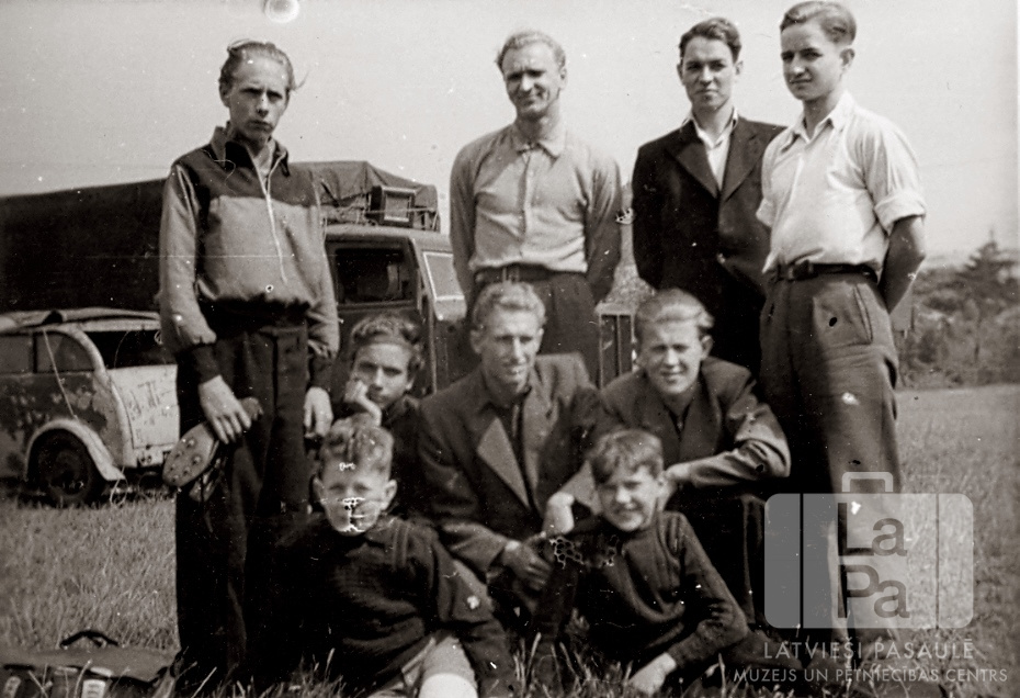 Jaunieši Bergedorfas Lobriģes sporta laukumā, netālu no Bernsenes (angļu zonā). Pirmajā rindā, no kreisās: ? Gobiņš, nezināms. Otrajā rindā, pirmais no kreisās: A. Adamovičs. Trešajā rindā, no kreisās: Guntis Linde, nezināms, ? Gobiņš, ? Gobiņš. Par šo gadījumu Andris Adamovičs atceras: "Pirmais stāvus – 400 m skrējējs Guntis Linde. Guntis Linde vēl vienmēr Kalifornijā, 2011. gadā, sacenšas skriešanas sacensībās sava vecuma klasē. Bilde ir uzņemta Bergedorfas Lobriģes sporta laukumā."