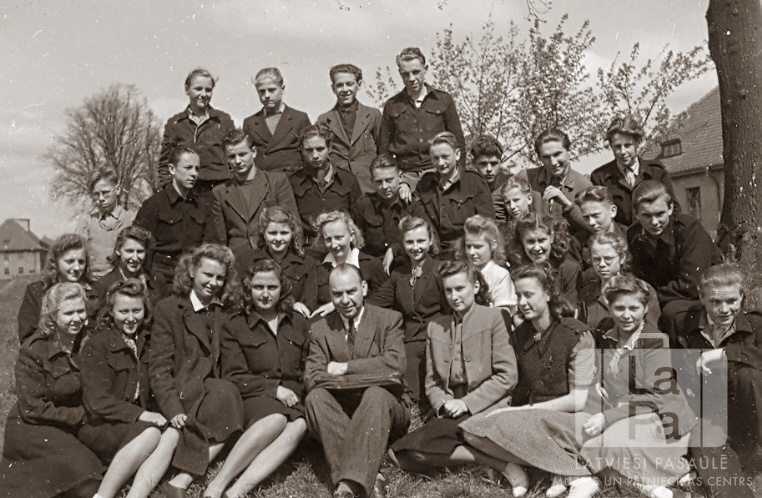 Apvienotās ģimnāzijas latviešu 1B klase Neištatē (Holšteinā, angļu zonā), īsi pirms skolas gada beigām. Pirmajā rindā, no kreisās: L. Trence, G. Lūkina, I. Vīksna, A. Rituma, klases audzinātājs Dobratvorskis, V. Puriņa, V. Balode, B. Runde, J. Kaminskis. Otrajā rindā, no kreisās: V. Mārtinsone, B. Šulce, A. Priede, I. Jablanovska, R. Dzelstiņa, J. Sproģe, Konrāda, I. Tēraude. Trešajā rindā, no kreisās: J. Tērauds, J. Ozoliņš, nezināms, A. Adamovičs, V. Pūce, J. Skrīveris, S. Ābens, A. Ruņģis, nezināms. Ceturtajā rindā, no kreisās: D. Tīliks, P. Šmits, H. Laķis, G. Salenieks, E. Šuopstiks, L. Zandbergs, nezināms.