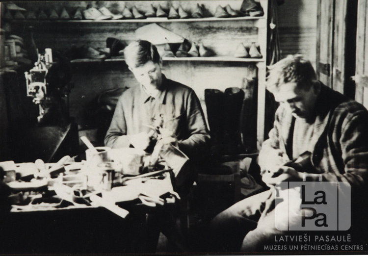 Divi vīrieši labo apavus kurpnieka darbnīcā Bernsenē (angļu zonā). Aizmugurē plaukti ar apaviem. No kreisās: Pēteris Riekstiņš un Jānis Stendzenieks.