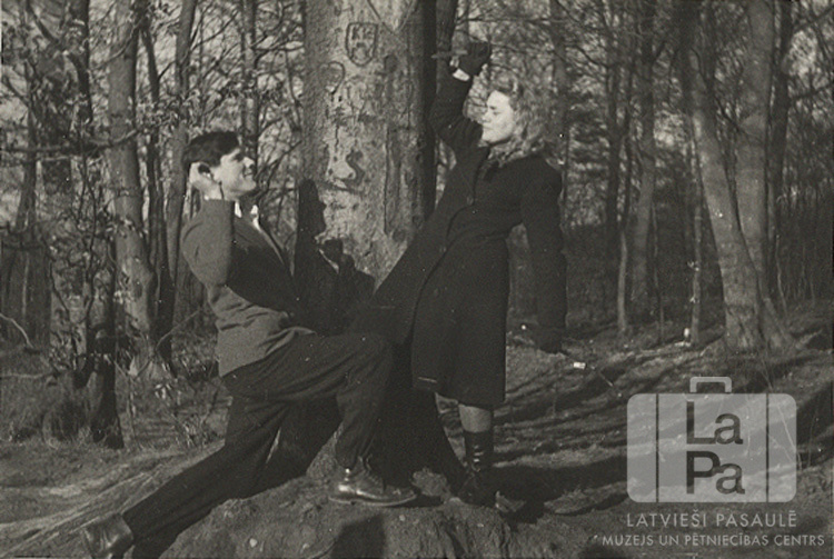 Puisis un meitene pozē mežā pie koka teātra mēģinājuma laikā Bernsenē (angļu zonā). No kreisās: Gunārs Bergmanis, Maija Gaiķe.