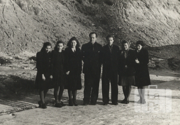 Ģimnāzijas 2. klase Bernsenes nometnē (angļu zonā). No kreisās: Jautrīte Svenne, Līvija Vilinska, Ilga Baude, klases audzinātājs – ilustrators Ernests Ābele, Nikolajs Lābāns, Biruta ?, Astrīda Riekstiņa.