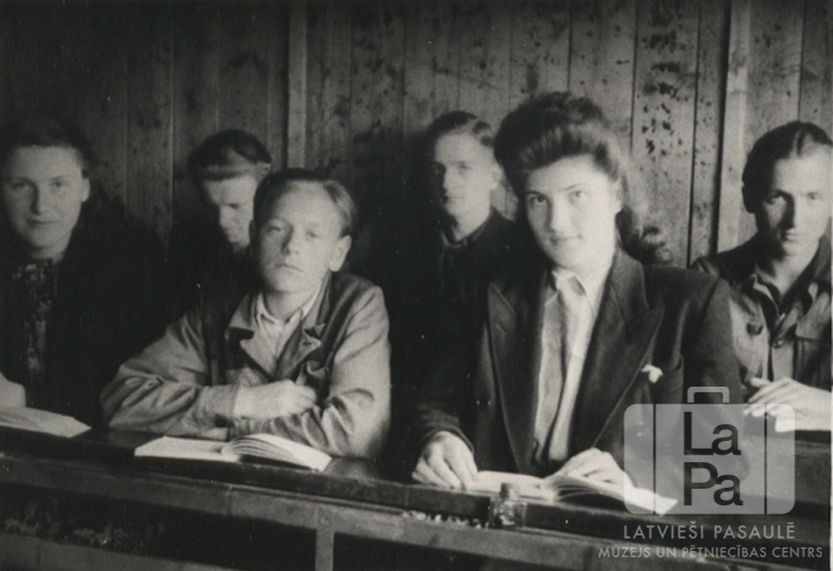 Skolēni solos Špakenbergas nometnē Gēsthahtā (angļu zonā). Pirmajā rindā, no kreisās: Ilga Baude, Uldis Plāte, Astrīda Riekstiņa (pr. Jansone). Otrajā rindā, no kreisās: Gunārs Bušmanis, Guntis Gobiņš, ? Gricēvičs.