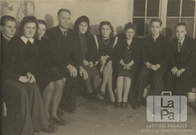 Ģimnāzijas 4. klases jauniešu grupa sēž pusaplī iekštelpās Špakenbergas nometnē Gēsthahtā (angļu zonā). No kreisās: Jānis Auziņš, Guna Nāgele, Ilga Baude, matemātikas skolotājs Fricis Šmithens, Astrīda Riekstiņa (pr. Jansone), Laima Bergmane, Velta Avotiņš, Guntis Gobiņš, nezināms (skolotāja dēls).