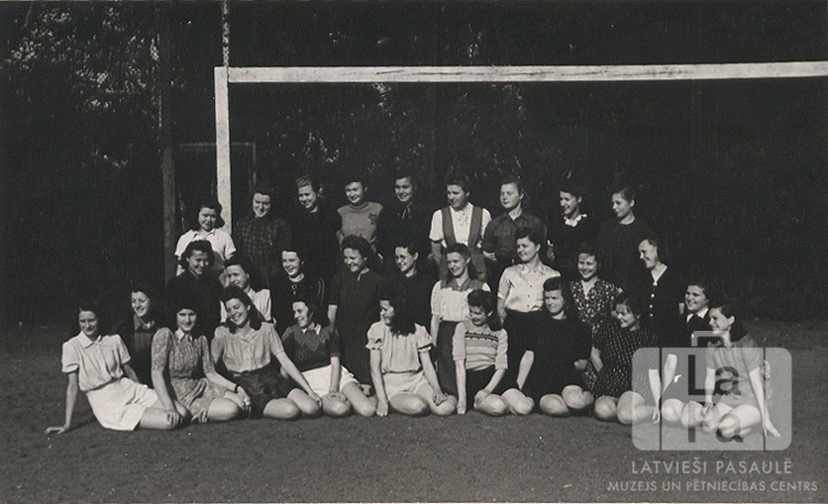 Jauniešu grupa sporta svētkos Saules nometnē Gēsthahtā (angļu zonā). Aizmugurē mežs. Pirmajā rindā, no kreisās: pirmā Vita Dzērve, otrā Astrīda Riekstiņa (pr. Jansone), trešā Dzidra Druvaskalns.