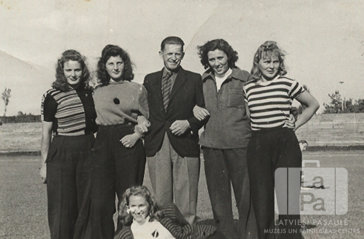 Šķēpmetējas ar vingrošanas skolotāju sporta svētkos laukumā Lībekā (angļu zonā). Stāv, no kreisās: pirmā Velta Višķere, otrā Mundrīte Riekstiņa, trešais Jānis Stendzenieks. Par šo gadījumu Astrīda Jansone (dz. Riekstiņa) atceras: "Mūsu onkulis Jānis Stendzenieks bija vingrošanas skolotājs, un viņš māsu mācīja mest šķēpu."