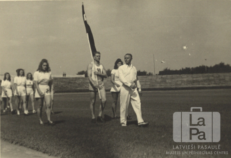 Sportisti soļo pa sporta laukumu sporta svētkos Lībekā (angļu zonā). Kolonnas sākumā karognesējs ar Latvijas Valsts karogu. Ceturtā no kreisās: Velta Višķere.