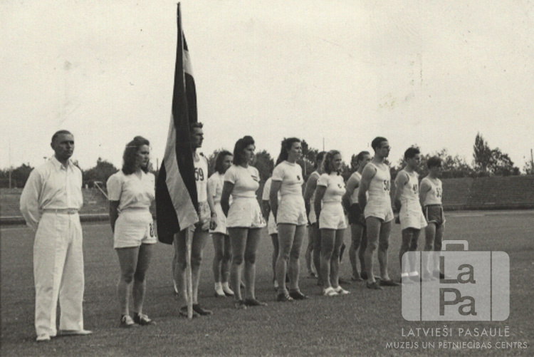 Sportisti stāv rindā uz laukuma sporta svētkos Lībekā (angļu zonā). Viens sportists tur sev blakus Latvijas Valsts karogs.