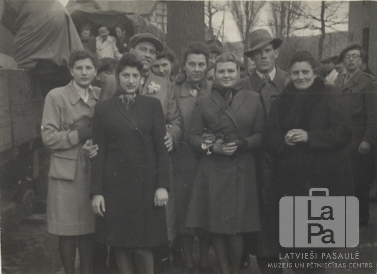 Ļaužu grupa sastājusies uz aizbraucēju pavadīšanu Saules nometnē Gēsthahtā (angļu zonā). Aizmugurē cilvēku pūlis; kreisajā pusē cilvēki kāpj smagajās mašīnās. Par šo gadījumu Astrīda Jansone (dz. Riekstiņa) atceras: "Pavadām trīs radiniekus ceļā uz Angliju. Aizbrauc Hugo Bergmanis, Austra Salna – Liepiņa, Gunārs Bergmanis."