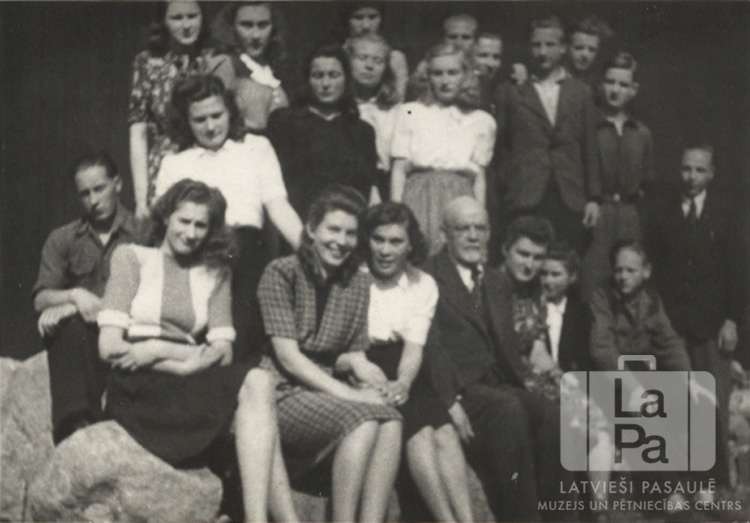 Ģimnāzijas 3. klases skolēnu grupa ar pasniedzēju Saules nometnē Gēsthahtā (angļu zonā). Pirmajā rindā, piektais no kreisās: klases audzinātājs, vēstures skolotājs Pēteris Dreimanis.