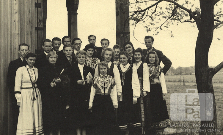 Ģimnāzijas absolventi Pinnebergā (angļu zonā). Meitenes tautastērpos, puiši uzvalkos. Par šo gadījumu Astrīda Jansone (dz. Riekstiņa) atceras: "Tas bija Pinnebergas ģimnāzijas vienīgais izlaidums."