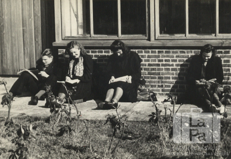Četri jaunieši ar grāmatām rokās atspiedušies pret ēkas sienu pirms pārbaudījumiem Pinnebergā (angļu zonā). No kreisās: Elmārs Freibergs, Vija Tillere, Astrīda Riekstiņa, Anna Blumberga.