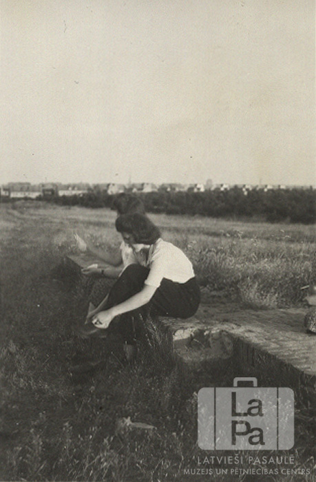 Mundrīte Riekstiņa auj kājas pirms šķēpa mešanas Saules nometnē Gēsthahtā (angļu zonā). Tālumā fonā ēku rinda.
