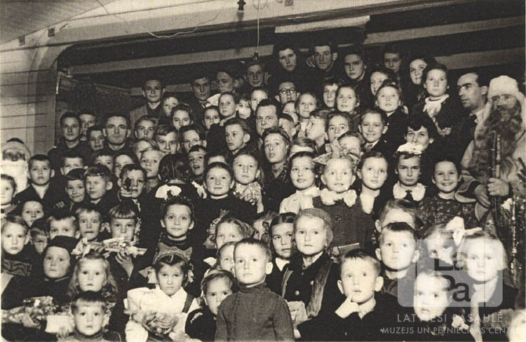Bērni un pieaugušie skolas Ziemsvētku eglītē Eihfeldas nometnē Mīldorfā (amerikāņu zonā). Abās malās grupai redzami Ziemassvētku vecīši.