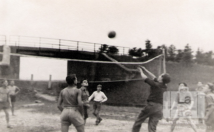 Volejbola spēle Eihfeldas nometnē Mīldorfā (amerikāņu zonā) ap 1947. gadu. Fonā šosejas tilts un priedes.