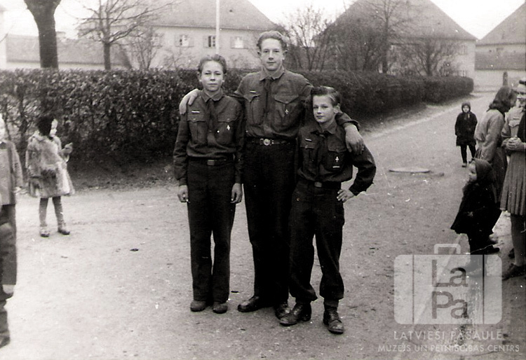 Trīs zēni skautu uniformās no Pededzes skautu vienības Vilku kopa stāv ceļa malā Mīldorfā (amerikāņu zonā) ap 1947. gadu. Apkārt uz ielas bērni un pieaugušie. Aiz skautiem dzīvžogs, fonā dzīvojamās mājas. No kreisās: Gunārs Potāpovs, Uldis Kiršteins, kopnieks Viesturs Zommers.