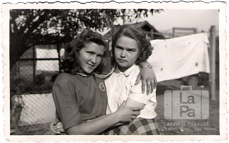 Divas meitenes apskāvušās stāv viena otrai blakus dārzā Mīldorfā (amerikāņu zonā). Aiz meitenēm aizmugurē kreisajā pusē koks, labajā pusē izkārta veļā. No kreisās: Biruta Segliņa, Skaidrīte Ozola.