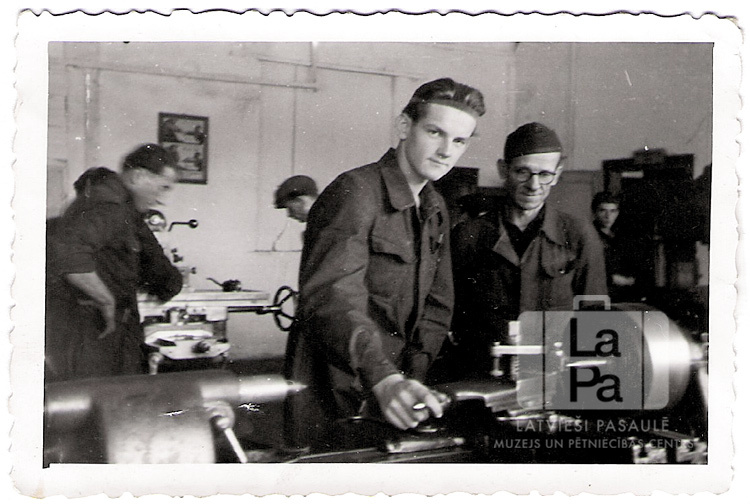 Jaunietis strādā pie virpas vecāka vīra uzraudzībā virpošanas darbnīcā Ingolštatē (angļu zonā). Trešais no kreisās (vidū, pie virpas): Jānis Zommers. Par šo gadījumu Biruta Zommere (dz. Segliņa) atceras: "Vidusskolēniem bija iespēja apmeklēt dažādus arodu kursus. Jānis Zommers apgūst virpošanas darbus IRO arodapmācības kursos Ingolštatē."