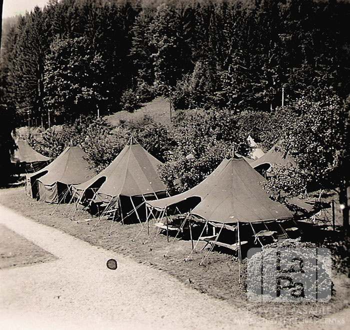 Lielas teltis meža malā vasaras nometnē Alpu kalnu pakājē Kīfersfeldenā (Kiefersfelden) bērniem un jauniešiem no Eihfeldas nometnes Mīldorfā (amerikāņu zonā) ap 1948. gadu. Kreisajā pusē ir grants celiņš, labajā pusē mežains kalns.