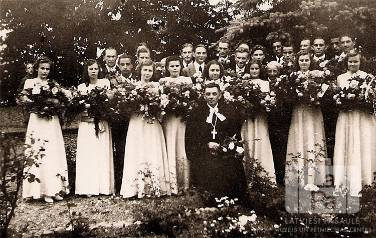 Jauniešu grupa ar mācītāju iesvētībās dārzā Neietingā (amerikāņu zonā). Visiem iesvētāmajiem jauniešiem un mācītājam rokās ir puķu pušķi. Priekšplānā puķu apstādījumi. Aiz grupas fonā ir lieli koki. Priekšā sēž mācītājs Alberts Galiņš (mācītāja tērpā).