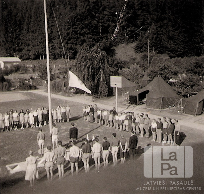 Bērni no Eihfeldas nometnes Mildorfā (amerikāņu zonā) stāv goda stājā karoga nolaišanas brīdī vasaras nometnē Kīfersfeldenā. Fonā granta taka, teltis un mežs, zem karoga masta uz zemes Igaunijas un Latvijas ģerboņi, veidoti no akmeņiem/smiltīm (?).