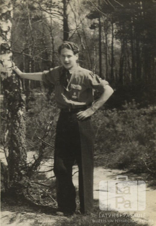 Ivars ? stāv, atspiedies mežā pret bērzu Volterdingenes nometnē (angļu zonā) 1948. gada vasarā. Jaunietim aiz muguras aiziet taka.