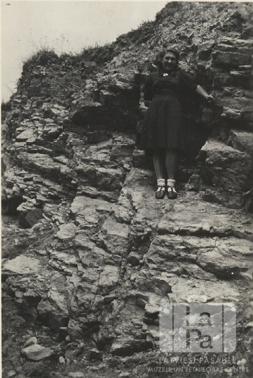 Dzidra Jansone (pr. Šmita) stāv pie klints angļu zonā 1949. gada Vasarsvētkos.