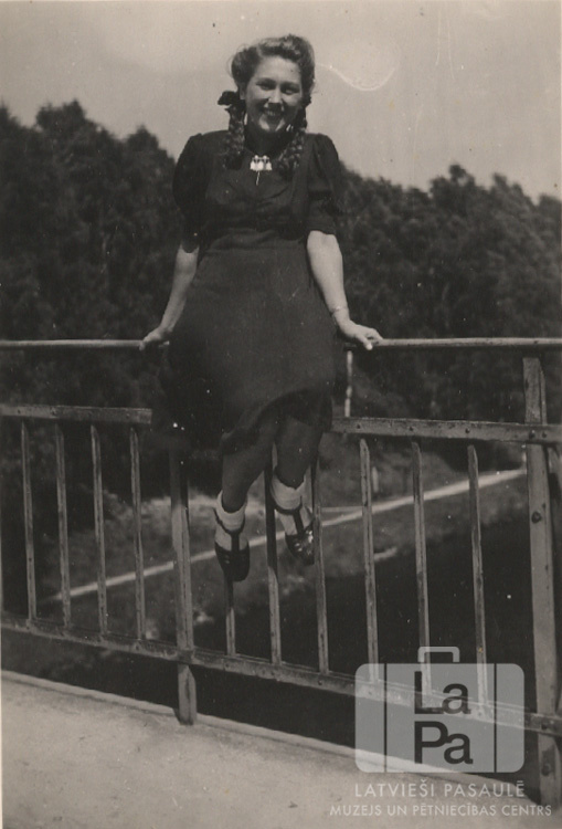 Dzidra Jansone (pr. Šmita) sēž uz tilta margām angļu zonā 1948. gada Vasarasvētkos. Zem tilta redzama upe, fonā kokiem apaudzis krasts.