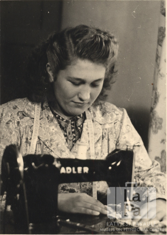 Dzidra Jansone (pr. Šmita) pie šujmašīnas angļu zonā. Uz melnās šujmašīnas redzams uzraksts "ADLER".