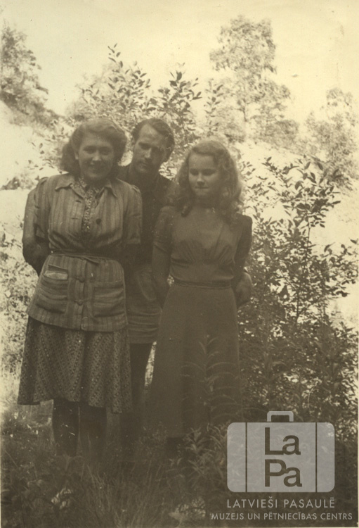 Trīs jaunieši pēc šķēršļu gājiena Eversburgas kalnos (angļu zonā) 1950. gada vasarā. Fonā ar kokiem apaugusi nogāze. Šķēršļu gājiens bija daļa no skautu un gaidu nometnes aktivitātēm. No kreisās: Dzidra Jansone (pr. Šmita), nezināms (skautu vadītājs), Maira Dreimane.