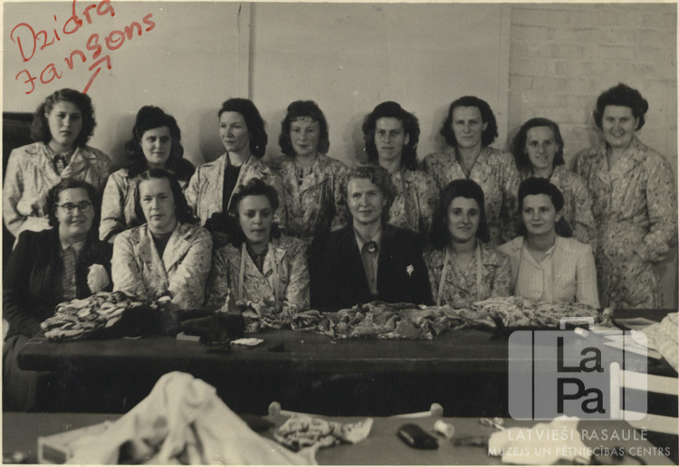 Sieviešu grupa šūšanas darbnīcā angļu zonā 1950. gada vasarā. Priekšplānā soli ar audumiem un šūšanas piederumiem. Otrajā rindā, pirmā no kreisās: Dzidra Jansone (pr. Šmita). Uz attēla ar sarkanu pildspalvu ir uzvilkta bulta un rakstīts: "Dzidra Jansons".
