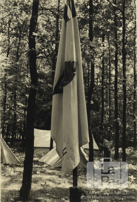 Kokā pakarināts karogs skautu un gaidu nometnē meža vidū Eversburgā (angļu zonā) 1950. gada vasarā. Fonā redzamas uzslietas teltis.
