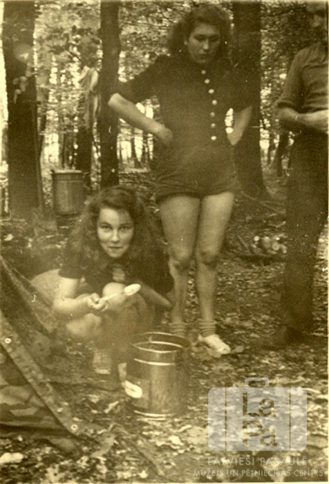 Trīs jaunieši pie telts skautu un gaidu nometnē meža vidū Eversburgā (angļu zonā) 1950. gada vasarā. Viena jauniete ar karoti rokā noliekusies pie metāla cilindra. No kreisās: gaidas Maira Dreimane, Dzidra Jansone (pr. Šmita), nezināms.