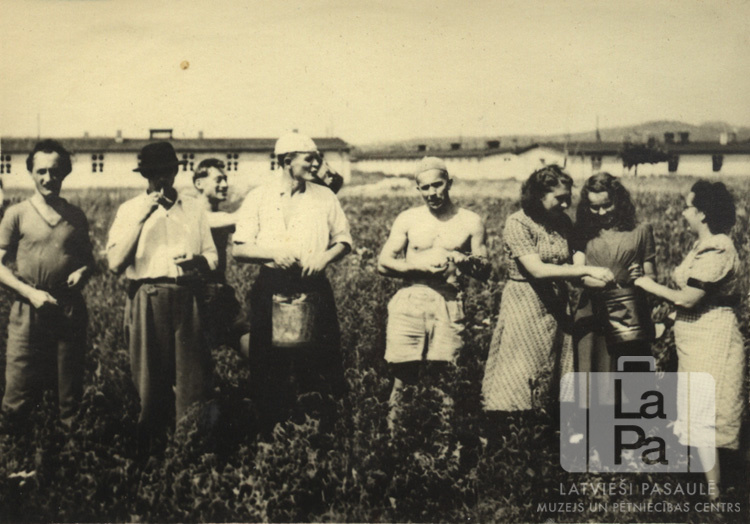 Ļaužu grupa stāv uz lauka angļu zonā 1950. gada vasarā. Fonā vienstāvu barakas. Par šo gadījumu Dzidra Jansone-Šmita atceras: "Zirņu lasīšana."
