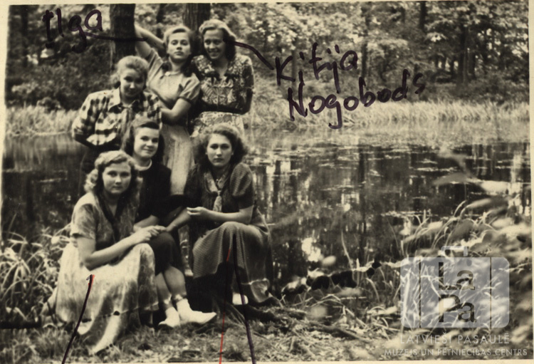Sešas meitenes pie ūdens angļu zonā 1950. gada vasarā. Uz attēla ar melnu krāsu rakstīts: "Ilga, Kitija Nogobeds, ... (nesalasāms)." Priekšā, no kreisās: Irma Krūze, nezināms, Dzidra Jansone (pr. Šmita). Aizmugurē, no kreisās: nezināms, Ilga ?, Kitija Nogobade.