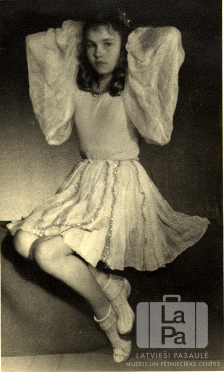 Meitene pozē koncerta tērpā Eversburgā (angļu zonā). Par šo gadījumu Dzidra Jansone-Šmita atceras: "Maira dejoja 1948. gada Ziemassvētku uzvedumā Eversburgā."