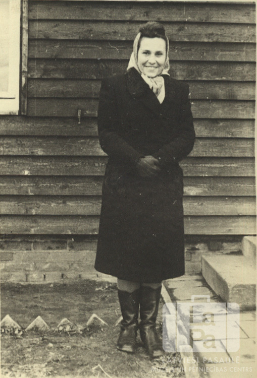 Skolotāja Irma Jansone mētelī un lakatā stāv pie koka ēkas Eversburgā (angļu zonā).