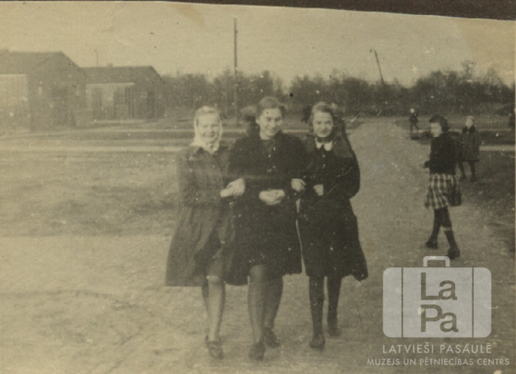 Par šo gadījumu Dzidra Jansone-Šmita atceras: "Tipiska DP nometņu aina: meitenes, elkoņos saķērušās, pastaigājas. Aizmugurē barakas."