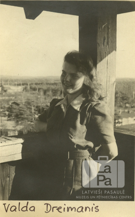 Valda Dreimane stāv ar skatu uz mežainu apkārtni Grēvenē (angļu zonā). Uz apmales attēla apakšā rakstīts: "Valda Dreimanis".