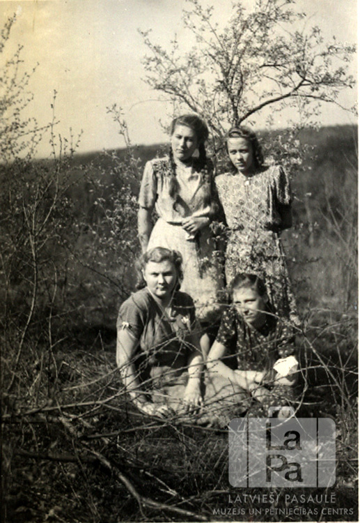 Četras meitenes Volterdingenē (angļu zonā). Apkārt krūmi, fonā paugurs. Priekšā, no kreisās: Irma Krūze, Austra ?. Aizmugurē, no kreisās: Dzidra Jansone (pr. Šmita), Kitija Nogobade.