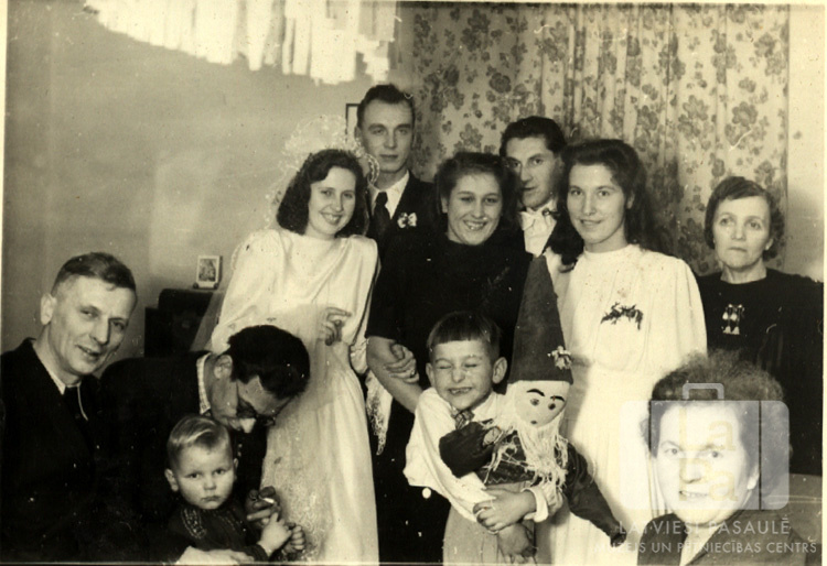 Kāzinieki istabā Harija un Ainas Tarzieru kāzās nometnē angļu zonā. Zēnam priekšplānā rokās rūķis ar bārdu un garu cepuri. Aizmugurē, no kreisās: pirmā Aina Tarziers (kāzu kleitā), otrais Harijs Tarziers (uzvalkā).