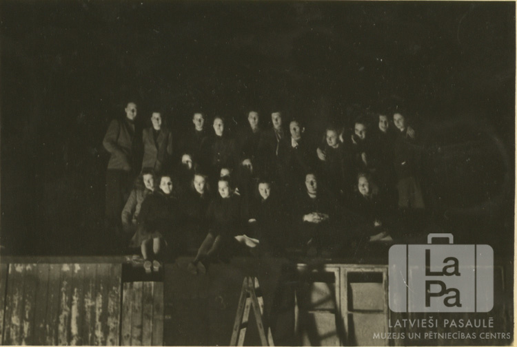 Jauniešu grupa tumsā uz kādas barakas jumta Volterdingenē (angļu zonā). Par šo gadījumu Dzidra Jansone-Šmita atceras: "Mums gāja jautri arī nometnē."