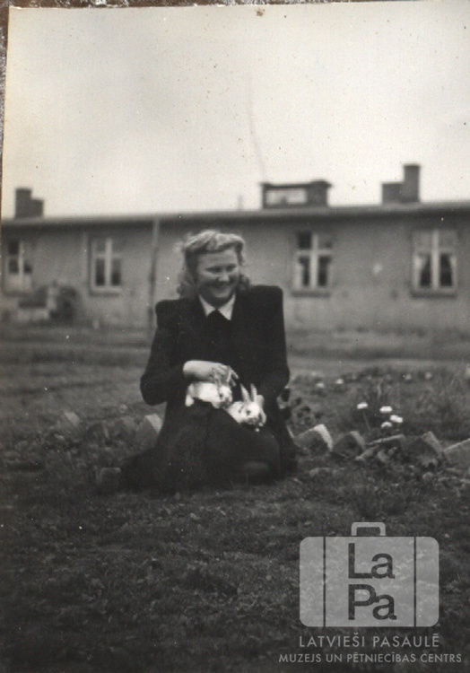 Irma Krūze sēž ar trušiem klēpī angļu zonā. Fonā vienstāvu baraka.
