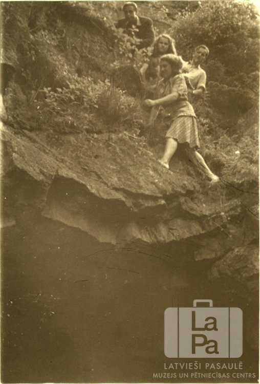 Jaunieši uz klints malas šķēršļu gājienā Eversburgas kalnos (angļu zonā). Šķēršļu gājiens bija daļa no skautu un gaidu nometnes aktivitātēm. Uz zemākās klints malas: Dzidra Jansone (pr. Šmita). Virs viņas: Maira Dreimane.