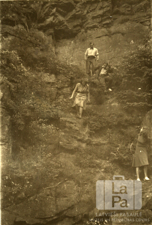 Jaunieši kāpj lejā pa klints krauju šķēršļu gājiena laikā Eversburgas kalnos (angļu zon). Šķēršļu gājiens bija daļa no skautu un gaidu nometnes aktivitātēm. Vidū Dzidra Jansone (pr. Šmita), lejā, labajā pusē, Maira Dreimane.
