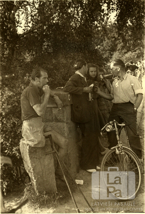Cilvēku grupa atpūšas pie akmens mūra pēc šķēršļu gājiena Eversburgas kalnos (angļu zonā). Šķēršļu gājiens bija daļa no skautu un gaidu nometnes aktivitātēm. Trešā no kreisās: Maira Dreimane, aiz viņas Dzidra Jansone (pr. Šmita).