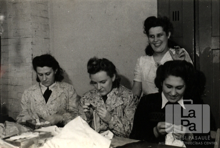 Sievietes šūšanas darbnīcā Ventorfā (angļu zonā) 1950. gada ziemā. Uz galda auduma gabali un šūšanas piederumi. Par šo gadījumu Dzidra Jansone-Šmita atceras: "Mūs māca šūt izceļošanai."