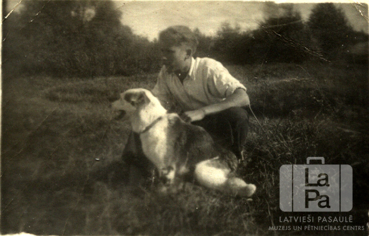 Puisis sēž zālē ar suni angļu zonā 1948. gada vasarā.