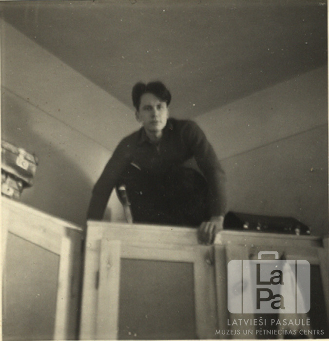 Modris Mednis sēž uz skapja Neištatē (Holšteinā, angļu zonā). Blakus uz skapja redzami čemodāni.