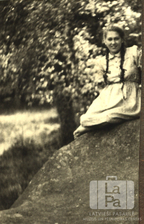 Dzidra Jansone (pr. Šmita) gaišā kleitā sēž uz akmens Volterdingenē (angļu zonā). Fonā koki.
